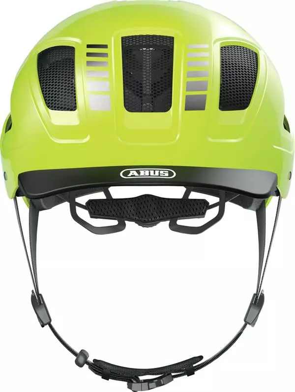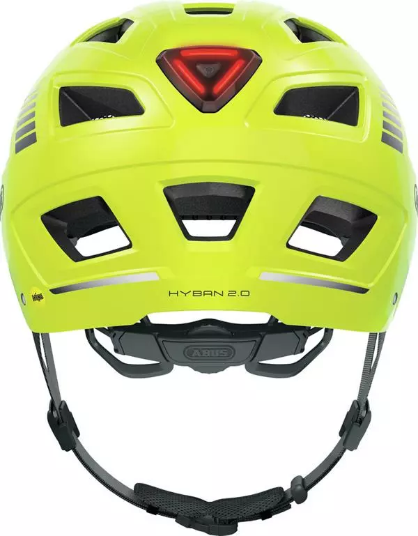 Abus Hyban 2.0 Mips Signal Yellow er en urban cityhjelm med bløde stropper og puder for optimal komfort. Kombinationen af en hård robust yderskal med store ventilationshuller er perfekt til citykørsel. cykelhjelmen har som ekstra sikkerhed rød lygte monteret bagpå. Selve lygten er monteret i en gummimembran som du prikker ud af hjelmen med en finger, når du skal skifte batteri. Du får simpel hagespænde med pudebeskytter. Denne gang har Abus endelig lavet et hagespændesystem som sikrer at hagespændet ikke glider af og bliver væk. Zoom Ace Urban skruespænde i nakken for optimal bespænding. Der er plads til hestehale, da spændet kan trækkes ned. 13 luftindtag samt fluenet foran og aftagelig skygge.