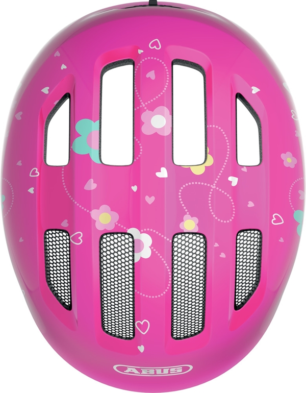 Abus Smiley 3.0 Pink Butterfly. Gennemtænkt cykelhjelm til børn. Størrelse small kan du anvende som førstegangshjelm. Abus er førende når det kommer til valg af cykelhjelm til de mindste. Størrelse medium er perfekt til de lidt større børn som stadigvæk er små. Abus Smiley modellen har igennem tiden udviklet sig løbende. Denne model har udvidet dækning ved kanterne som beskytter mere af hovedet. Skruespændet i nakken kan spændet ind og ud og så kan det også flyttes op og ned. Dette er hestehale kompatibelt. Du får også integreret insektnet og reflekser.